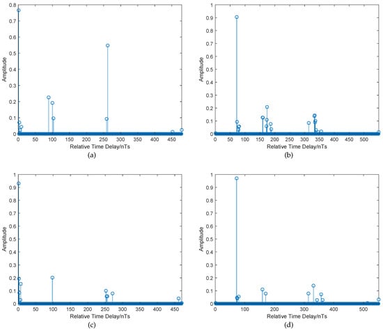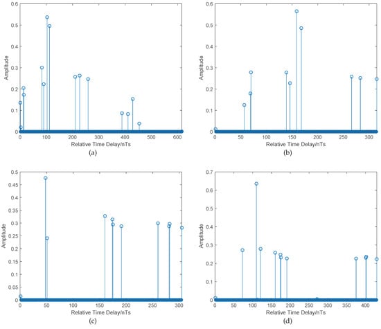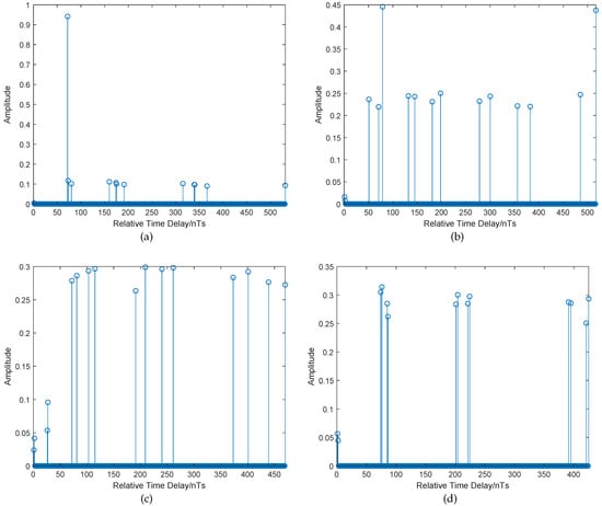 Normalized CIRs of channel with different sea surface boundaries in 1.29 m SWH. Sea surface boundaries of each figure: (a) Sea Surface 1; (b) Sea Surface 2; (c) Sea Surface 3; (d) Sea Surface 4.