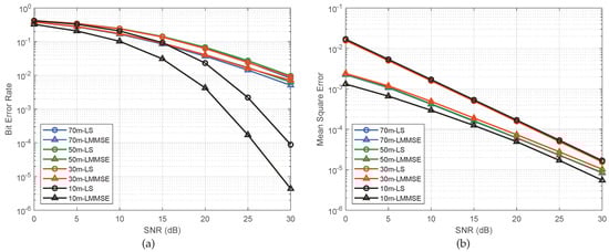 (a) bit error rate (BER) performance of channels in different receiving depth, estimated by LS and LMMSE algorithms, respectively. (b) MSE performance of channels in different receiving depth, estimated by LS and LMMSE algorithms, respectively.
