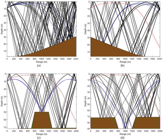Eigenrays of channel with different sea bottom boundaries. The color of lines indicates whether eigenrays hit surface boundary or bottom boundary of the sea. Sea bottom boundaries of each figure: (a) rising bottom; (b) falling bottom; (c) protruding bottom; (d) sagged bottom.