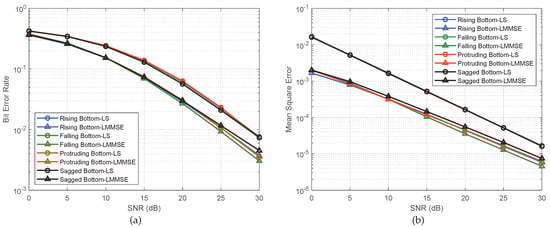 Figure 11 is plotted to compare the BER and MSE performance between the four channels. The BER performance of different channels in LS algorithm is all around 0.0075 when SNR is 30 dB. The value is similar to the worse BER value in Figure 8a, implicating that there may exist a worst-case performance bound of UWA channel estimation through LS algorithm. In addition, the BER performance of different channels in LMMSE algorithm has a few differences. The channel with falling bottom is estimated in the best BER performance while the channel with sagged bottom is estimated in the worst BER performance. The performance of MSE also has similar characteristics to that of BER in LMMSE algorithm, shown in Figure 11b.