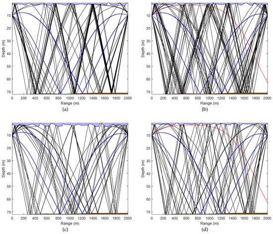 Eigenrays of channel with different sea surface boundaries. The color of lines indicates whether eigenrays hit surface boundary or bottom boundary of the sea. Sea surface boundaries of each figure: (a) Sea Surface 1; (b) Sea Surface 2; (c) Sea Surface 3; (d) Sea Surface 4.