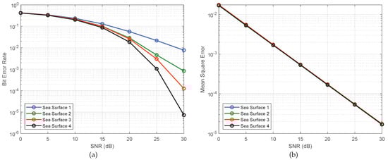 (a) BER performance of channels in different sea surfaces boundaries. (b) MSE performance of channels in different sea surfaces boundaries.