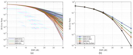 Figure 15a shows the BER curves of channels with different SWH. The blue, green, and red curves represent the BER performance of the modelled channel with 0.5 m, 1.29 m, and 2 m SWH, respectively. For each color, there are 20 curves. When SNR is 30 dB, the worst curves of the three colors have similar BER value with the worst curves in Figure 8a and Figure 11a, which confirms the existence of worst-case performance bound of UWA channel estimation through LS algorithm. Considering the distribution characteristic of curves in different colors, the blue, green, and red curves are mainly concentrated in the high, middle, and low BER performance part of the distribution range, respectively.