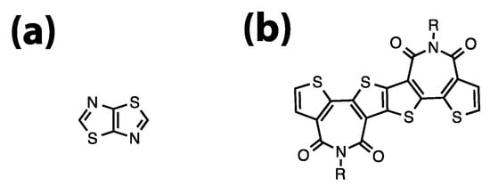 Thiazolothiazole (TzTz) (Figure 1a) is an electron-deficient unit that was introduced in semiconducting polymers as well as molecules in the earlier stage, and has provided high-performance materials for OFETs as well as OPVs [,,,,,,,]. For example, we have reported a series of TzTz-thiopohene copolymers (PTzBTs) [,,]. PTzBTs showed relatively high hole mobilities of 0.4 cm2 V−1 s−1 and relatively high power conversion efficiencies of more than 7% []. However, although some TzTz-based small molecules have been reported to be n-type semiconductors [], TzTz-based polymers are mostly p-type semiconductors, and, to the best of our knowledge, none of them have been reported to show n-channel or even ambipolar characteristics. This is most likely because the electron deficiency of TzTz is relatively weak [], and thus TzTz-based polymers tend to show shallow LUMO energy levels (ELUMO).