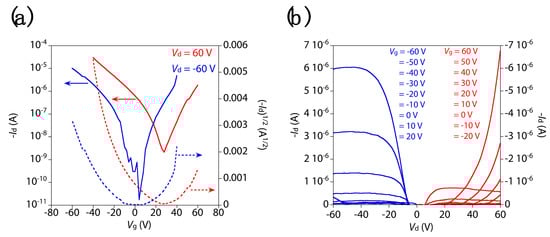 (a) Transfer curves (p-channel: Vd = −60 V, n-channel: Vd = 60 V) and (b) out-put curves (p-channel: Vg = −60~20 V, n-channel: Vg = 60~−20 V) of a PTzTBI-based field-effect transistor (OFET).