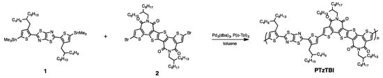 Distannylated TzTz monomer (1) [] and dibrominated TBI monomer (2) [] were synthesized according to the reported procedure. Synthesis of PTzTBI (Scheme 1) was carried out as follows.