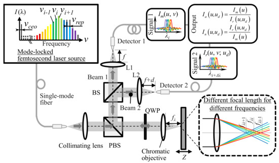 Figure 1 shows a schematic of the optical configuration for the fiber-based dual-detector chromatic confocal probe with a mode-locked femtosecond laser source [3]. A mode-locked femtosecond laser source is employed, while single-mode step index fibers are used as the signal-propagating media. The kth optical mode in the mode-locked femtosecond laser has a specific frequency νk, which corresponds to the deterministic working wavelength λk, which can be expressed as follows by using the carrier envelope offset frequency νceo and the pulse repetition rate νrep [32,33,34]: