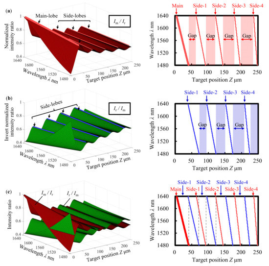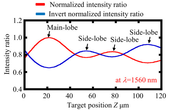 As illustrated in Figure 6c, the main-lobe and side-lobes are employed in the wavelength-to-displacement encoding, but gaps between main-lobe and side-lobes make the final measurement range discontinuous. In order to eliminate the gaps, side-lobes of the axial response of the invert normalized intensity ratio are employed. Therefore, the following relationship should also be satisfied: