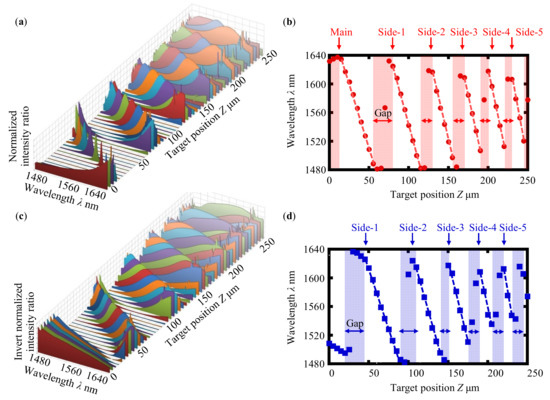 Experiments were carried out to investigate the feasibility of the proposed measurement range expansion method. The plane mirror was made to move along the Z-direction in a step of 2 μm to obtain the axial responses. It should be noted that the displacement of the plane mirror was measured by a capacitive displacement sensor simultaneously for comparison. Peak wavelengths were calculated from the centroid positions of the corresponding normalized intensity ratio, as well as the invert normalized intensity ratio at each Z-position of the mirror. Figure 8a shows the normalized intensity ratio obtained at each Z-position over a Z-directional scanning range of 250 μm. As can be seen in Figure 8a, not only the main-lobe but also the side-lobes were clearly observed. Although the peak widths of the sub-lobes were found to become wider as the increase of the Z-displacement of the plane mirror, the sharpness of the sub-lobes was enough to be used in the wavelength-to-displacement encoding. Figure 8b shows the peak wavelength obtained from the normalized intensity ratio in Figure 8a at each Z-directional position of the plane mirror. As can be seen in the figure, a linear relationship between the peak wavelength and the axial Z-directional displacement of the plane mirror was found for the main-lobe and each of the side-lobes. Meanwhile, as predicted in the results of the above theoretical calculations, a gap between each of the neighboring lobes was found. Figure 8c shows the invert normalized intensity ratio obtained at each Z-position, which was calculated from the same intensities employed to calculate the corresponding normalized intensity ratio shown in Figure 8a. As can be seen in Figure 8c, the main-lobe and the side-lobes were clearly observed in the obtained invert normalized intensity ratio. In the same manner, as the case of normalized intensity ratio Ia, the relationship between the peak wavelength and the axial Z-directional displacement of the flat mirror was investigated by extracting the peak wavelengths in the invert normalized intensity ratio In shown in Figure 8c. The result is summarized in Figure 8d. As predicted in the results of the above theoretical calculations, the peak frequency in the invert normalized intensity ratio at a specific Z-directional position of the plane mirror was found to shift along the axial direction with respect to that of the normalized intensity ratio shown in Figure 8b.