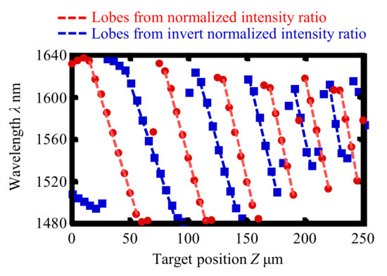 In order to obtain the relative maximum intensity values for wavelength-to-displacement encoding of the side-lobes, let Equation (13) be equal to zero and get the relationship between the target position z and wavelength λ: