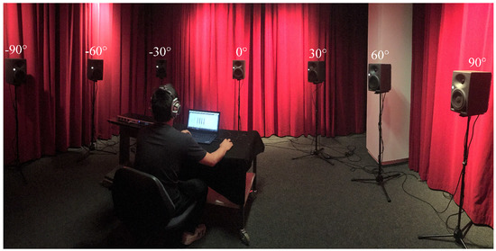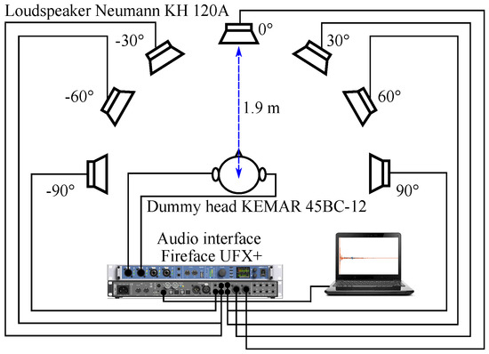 Seven pairs of BRIRs were measured with a low-noise dummy head KEMAR 45BC-12 at azimuth angles of −90°, −60°, −30°, 0°, 30°, 60°, and 90° relative to the dummy head in a listening room (area of ≈31.6 m2, height of ≈3.2 m), which was designed under the ITU-R BS.1116 standard and has a broadband reverberation time of about 260 ms [23]. Seven equally-calibrated Neumann KH 120A loudspeakers located at the respective incident angles were used as sound sources for the recording of non-individual BRIRs. The distance between each loudspeaker and the dummy head was 1.9 m. A five second-long exponential sweep [24] from 20 Hz–20 kHz was used as an excitation signal, and the BRIR measurement for each azimuth angle was repeated five times. The BRIRs recorded were then truncated by a 260 ms-long time window. The measurements were performed at a sampling frequency of 44.1 kHz using a Fireface UFX+ audio interface. Figure 2 shows an illustration of the measurement setup.