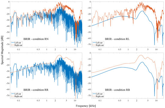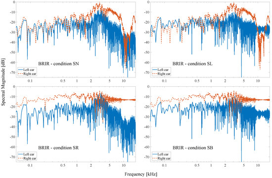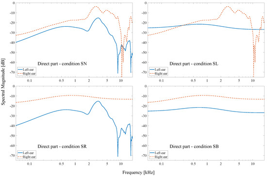 Figure 3 shows the processed spectral magnitude of the direct part in the pair of BRIRs at 60° for the “SN” (left top), “SL” (right top), “SR” (left bottom), and “SB” (right bottom) conditions. After the smoothing process, the spectral magnitude of the direct part was almost constant across frequencies, and the specific notches and peaks disappeared. The reverberant parts in BRIRs remained unchanged and were added to the processed direct parts to generate modified BRIRs. Figure 4 shows the resulting magnitude spectra of modified BRIRs at 60° for different conditions. The magnitude spectra showed in each panel of both figures were normalized to the maximum magnitude level of the right ear BRIR.