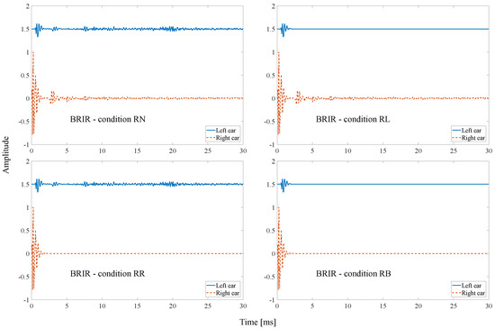 Examples of BRIRs with modified reverberant parts at 60° for the “RN” (left top), “RL” (right top), “RR” (left bottom), and “RB”(right bottom) conditions in the time domain. The solid and dashed curves denote the modified BRIRs of left and right ears, respectively (the left ear BRIR was offset by 1.5 for better visibility).