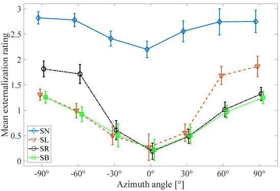 For each azimuth angle, an analysis of variance (ANOVA) with post-hoc-test (5% significance level with Bonferroni adjustment) was performed to show the significant differences of externalization ratings among the “SN”, “SL”, “SR”, and “SB” conditions. Overall, consistent with the visual inspection of Figure 8, the results for the “SN” condition differed significantly from the results for the other three conditions across various azimuth angles (p ≪ 0.05). In the case of azimuth angles of 0° and ±30°, no significant difference was observed among the “SL”, “SR”, and “SB” conditions (p > 0.2). For lateral sound sources located at −60° and −90°, the results for the “SR” condition differed significantly from the results for the “SL” and “SB” conditions (p ≪ 0.05), while there was no significant difference between the externalization ratings for the “SL” and “SB” conditions (p > 0.3). In the case of 60° and 90° sound sources, there was no significant difference between the externalization ratings for the “SR” and “SB” conditions (p > 0.3), but each differed significantly from the results for the “SL” condition (p ≪ 0.05).