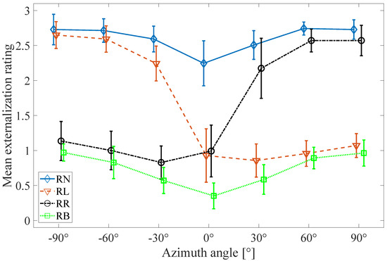 In the case of the “RB” condition, the mean externalization ratings increased as the sound source moved from frontal to lateral incidence angles, but they were overall lower than 1.0, corresponding to sound sources being internalized or very close to subjects’ heads. In addition, the ratings were lower than those for the other three conditions for all azimuth angles. For a frontal sound source, the externalization ratings were almost the same for the “RL” and “RR” conditions. In the case of negative azimuth angles, the externalization ratings were substantially higher for the “RL” condition than the “RB” and “RR” conditions and slightly lower than the “RN” condition. The ratings for the “RR” condition were a little higher than those for the “RB” condition. In contrast, for positive azimuth angles, the ratings were higher for the “RR” condition than the “RB” and “RL” conditions and a little lower than the “RN” condition. Furthermore, the ratings were slightly higher for the “RL” condition than the “RB” condition.