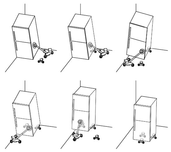 - Ito, T.; Shirafuji, S.; Ota, J. Development of a Mobile Robot Capable of Tilting Heavy Objects and its Safe Placement with Respect to Target Objects. In Proceedings of the 2018 IEEE International Conference on Roboics and Biomimetics (ROBIO2018), Kuala Lumpur, Malaysia, 12–15 December 2018; pp. 716–722. [Google Scholar]