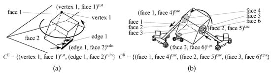 For a description of the contact state without the exact configurations, we adopt the concept of principal contact (PC) [18] to express the contact states. A PC is a contacting pair between the geometrical primitives (a vertex, an edge, or a face). A PC is denoted by , where a is a geometrical primitive on the object and b is a geometrical primitive on a polyhedron of the environment or a robot. Furthermore, we denote the object–environment PC and object–robot PC by and , respectively, for clarity.