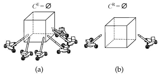 The active robot actively exerts contact forces to an object or releases contact from an object. Furthermore, the active robots changed the contact state in a system. In comparison, the passive robots could not exert contact to the object actively. They got contact with an object or released contact from an object when the object moved. Therefore, transitions that caused by the passive contact changes do not occur without the existence of active robots. Similarly, without the existence of active robots, ECFs cannot change except for the transition between isogenous ECFs, as shown in Figure 10c.