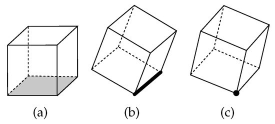 respectively, where is the basis for the geometrical force, and and are the bases for the static frictional force. The geometric and static frictional forces applied on edge–edge–cross contact can also be represented in the same manner (see Figure 7b). To deal with edge–face contacts and face–face contacts, we consider them as two point contacts on the edge and three non-collinear point contacts on the face (such as the boundary points of the contacting area), as shown in Figure 7c,d. The wrench space spanned by the bases is calculated by summing up the bases for all PCs in the given CF as