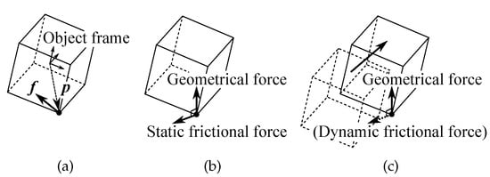 In our method, we need to distinguish whether relative sliding happening on a contact for determining the constraints required to realize the full constraints of the object. For example, Figure 2 shows the difference of the required constraints in the quasi-static manipulation of an object that lies on a floor with an edge contact when a robot contacts with it as a point–face contact (in the planar case). Manipulation without relative sliding on the point with the help of floor’s static friction, as shown in Figure 2c, requires a robot to tilt the object. However, for manipulation with relative sliding between the object and the floor, it is difficult to predict the resultant motion of the object because of dynamic friction, as shown in Figure 2b. To guarantee that the target motion will be realized, an additional robot is required (see Figure 2c), and the number of robots required is different between the two cases.