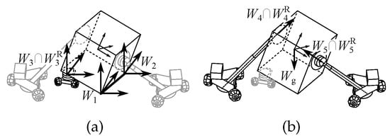 The wrench space spanned by RCFs requires more consideration because not only the contacts between the object and the robots, but also the kinematics of the robots affect the spanned wrench space on the object. The limitation on the available actuators of the robot, the passive joints in the robot, or other kinematics restrictions determine the possible wrench. The possible wrench space for a given robot kinematics and its configuration is also represented by the wrench bases aside from the bases of contact. For example, Figure 9 shows the wrench bases of a robot to push an object and the force bases of a robot to carry an object; these robots have passive joints and can be used in the latter section. The robot to push an object has a basis represented as a force along with the axis of the linear actuator, as shown in Figure 9a. The robot to carry an object has three bases represented as forces passing through the axes of the passive universal joint, as shown in Figure 9b. Let represent the wrench space spanned by the robot based on its kinematics. By substituting the wrench spaces spanned by the forces applied by robot–object contacts in Equations (6) and (7) with the wrench spaces spanned by the robots based on their kinematics, the followings equations are obtained