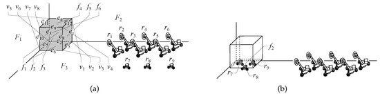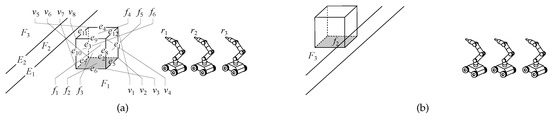 In the second example, a cuboid is loaded onto a step by using mobile robots, as shown in Figure 13. The faces, the edges, and the vertices of the cuboid are denoted as , , and , respectively. The floor is denoted as and the faces consisting of the step are denoted as and .