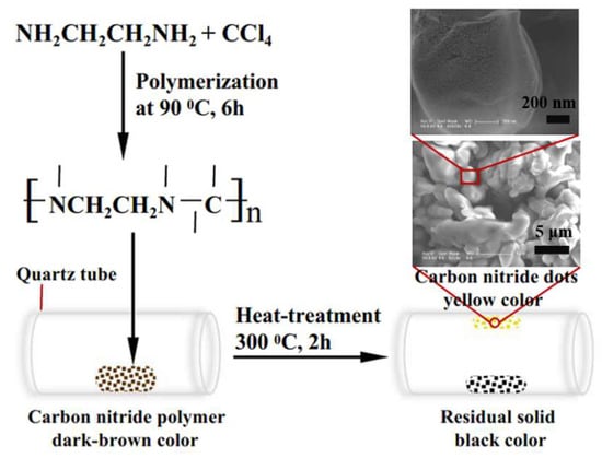 - Liu, S.; Tian, J.; Wang, L.; Luo, Y.; Zhai, J.; Sun, X. Preparation of photoluminescent carbon nitride dots from CCl4 and 1, 2-ethylenediamine: A heat-treatment-based strategy. J. Mater. Chem. 2011, 21, 11726–11729. [Google Scholar] [CrossRef]