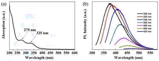 Figure 4 shows the optical properties of CNDs aqueous dispersion. It is seen that there are two typical absorption peaks at 275 and 325 nm, attributed to π–π* transition of s-triazine and n–π* transition of defect state on the surface of the CNDs, respectively (Figure 4a) []. CNDs emit blue fluorescence at ca. 420 nm under the excitation of 360 nm irradiation (Figure 4b). Similar to most of carbon dots, the PL of the obtained CNDs is also excitation wavelength-dependent. The emission peak of CNDs is red-shifted from 375 to 450 nm with the excitation wavelength changing from 300 to 400 nm.