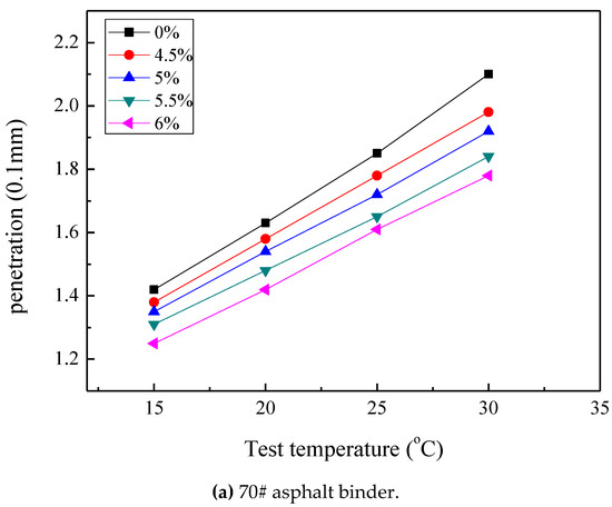 The test temperatures were set as 15 °C, 20 °C, 25 °C and 30 °C in this study. The penetration of matrix asphalt and SBS-modified asphalt for different test temperatures is shown in Figure 1. For SK70# and SK90# matrix asphalt, the SBS modifier could lower the penetration of them, which lead to the asphalt binder being hardened. Take the test temperature of 25°C and SK90# matrix asphalt as example, the penetration of SBS modified asphalt with SBS dosages of 4.5%, 5%, 5.5%, and 6% decreased by 10.3%, 12.9%, 14.4% and 15.5% respectively, compared to the matrix asphalt.