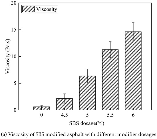 Another index to measure the performance of asphalt binder is the viscosity. The smaller the viscosity of asphalt at high temperature, the better the asphalt mixture can be mixed and compacted [18]. Therefore, the SHRP method requires the rotary viscosity at 135 °C shall not exceed 3 Pa.s. The Brookfield rotary viscometer was adopted in this paper to determine the rotational viscosity of SBS modified asphalt. In the test, the rotor speed was 20 rpm/min, the rotor of SBS modified asphalt was 27#, and the mass was 10.5 g, the mass of 90# matrix asphalt sample was 8.5 g using 21# rotor. The test temperature were 135 °C, 140 °C, 150 °C, 160 °C, 170 °C, 177 °C and 190 °C respectively, and the dosages of SBS modifier were 0%, 4.5%, 5%, 5.5% and 6%. The test results are shown in Figure 5.