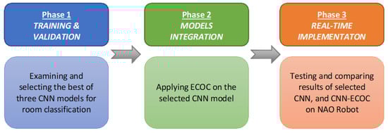 The process of this work can be divided into three phases, as shown in Figure 3. Phase 1 was aimed at fine-tuning three different CNN models, i.e., VGG16, VGG19, and Inception V3, on five categories of rooms from the Places205 dataset, in order to select the best model for real experiments on a NAO robot. In addition, all models were examined in this phase after cleaning the dataset by removing all unrelated images to the scenes, and the results were compared before and after cleaning the dataset. In phase 2, the goal was to design multi-binary classifiers of the selected CNN from phase 1 and combine their results through the ECOC algorithm and ECOC-REG. Finally, testing the selected CNN, CNN-ECOC, and CNN-ECOC REG through real experiments on a NAO robot, and comparing the results was the goal of phase 3. The importance of this phase is to show how these models performed on images from robots, e.g., NAO, in which those images are quite different in the level of view from the existed dataset. Phase 1 and phase 2 are explained in detail in this section, whereas phase 3 is explained in the next section.