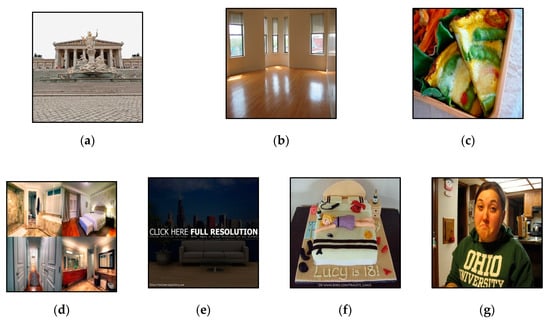 Examples of removed images from room dataset of Places. (a) Not belonged to; (b) no furniture; (c) not wide scene; (d) multi-scenes in an image; (e) including texts; (f) fake scene; (g) focusing on people.