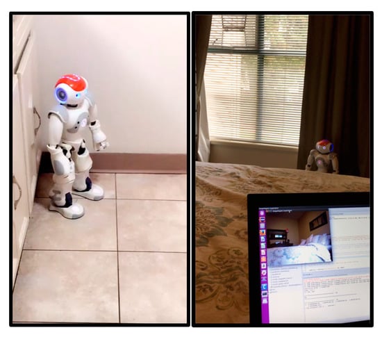 The physical platform, shown in Figure 5, used to experimentally validate this work is the humanoid robot NAO V4 (H25), i.e., twenty five degrees of freedom (DOF). Twenty five DOF means the robot consists of 25 different motors for controlling different actuators. NAO is a human-like, medium-sized humanoid robot, and is fully programmable to perform many tasks autonomously. It was designed by Aldebaran Company, owned afterward by SoftBank Group. It is equipped with many proprioceptive and exteroceptive sensors. Proprioceptive sensors acquire internal information of the robot, while exteroceptive sensors acquire external information of the environment. For this project, the top camera, which located in robot’s forehead, was used to capture room images. The important specification for this work is the height of the robot, which is 573 mm, while the top camera was at the level of 514.29 mm. Through the main software of Nao, i.e., Naoqi, several methods can be used from AlPhotoCapture module for real experiments.