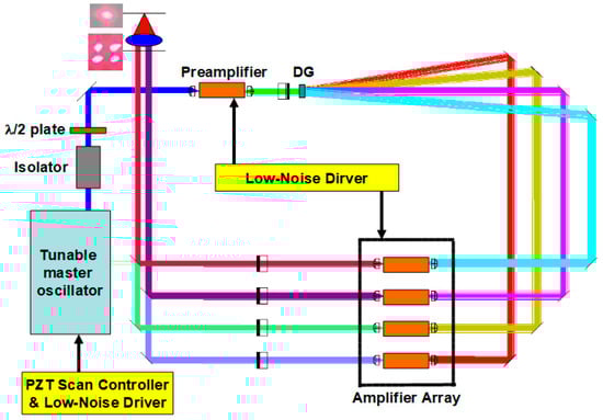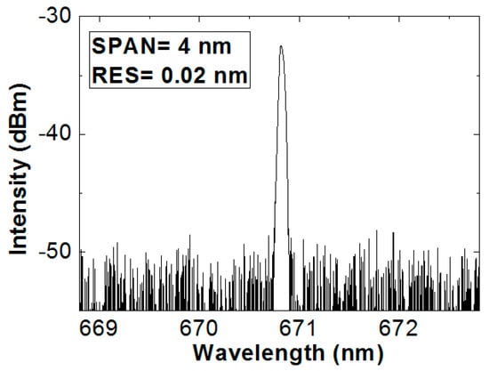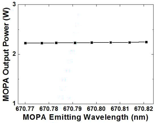 Several approaches have been demonstrated previously. Solid state lasers usually yield 1342-nm lasing by Nd:YVO4 or Nd:YAP crystal at first, then shift to 671-nm lasing by second harmonic generation (SHG), which can achieve output optical power of 1.2 W [,]. However, wall-plug efficiency (WPE) of solid-state lasers is very low and wavelength tuning is difficult to achieve. Dye lasers can directly yield 671-nm pulsed lasing by pumping light, without using SHG, which can achieve average optical power of 2 W and is commercially available []. However, they are usually large in volume and toxic. Laser diodes based on InGaP/AlGaInP quantum well can achieve continuous-wave (CW) output power of 5.6 W with very high WPE of 41% [], although the optical spectrum is a multiple longitudinal mode. Commercial tunable lasers based on semi-conductor devices can only achieve a CW output power of 500 mW [,,]. They usually use a very simple master oscillator power amplifier (MOPA) scheme, which includes only one tapered semi-conductor optical amplifier (SOA).