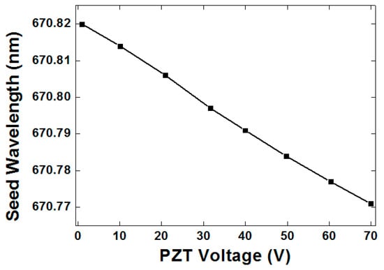 The master oscillator is a Littrow-type external-cavity oscillator, as shown in Figure 2. It is comprised of a Fabry-Perot laser diode with GaInP/AlGaInP quantum wells and AR/HR facet coating, an aspherical collimated lens with 2.75-mm focal length, a blazed grating of 1800 lines/mm, and a reflector. The first order of the grating feeds back to the laser diode for locking the wavelength and the zero order is the output of the master oscillator. The external-cavity length is about 6 cm, which is defined from rear facet of the laser diode to the blazed grating. The optical spectrum is shown in Figure 3. A single-frequency operation at 670.8 nm, with side mode suppression ratio (SMSR) of more than 16 dB, is observed. A piezoelectric ceramic component is attached to the back of the grating. By properly designing the rotation arm length and PZT moving step, the oscillating wavelength can be finely tuned at 0.2-pm resolution. The mode-hop free tuning range of 49 pm (32.6 GHz), from 670.820 to 670.771 nm, was achieved by tuning the PZT voltage from 1 to 69.9 V, as shown in Figure 4. Wider tuning range of more than 10 nm with mode hopping was also achieved, combined with a driving current tuning of the laser diode. The maximal output power is about 30 mW under CW driving current of 83 mA. The master oscillator is temperature controlled at 25 °C by two, single-stage, Peltier coolers for suppressing the working wavelength perturbation. Besides that, an optical isolator (Thorlabs IO-5-670-VLP) is inserted to protect the laser diode from the cascaded optical pre-amplifier.
