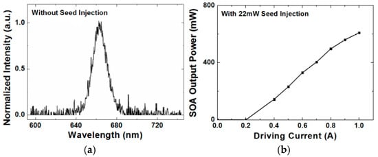 Gain spectrum without seed injection: (a) and P-I with seed injection; (b) of the 670 nm semi-conductor optical amplifier (SOA).