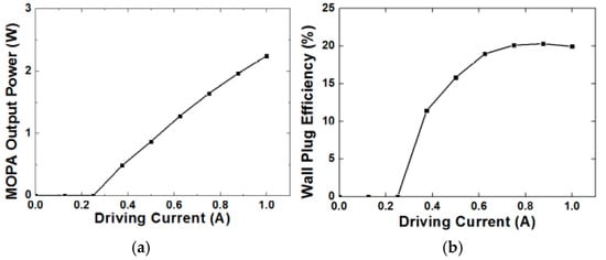 Optical power (a) and wall plug efficiency (b) of the MOPA system versus driving current.