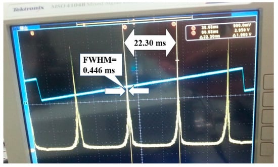 A spatial beam combination was built to compress the total size of the 4 sub-beams from the amplifier array. Four mirrors were used to rearrange the sub-beams into a 2 × 2 pattern, as shown in Figure 1. The propagation direction of all the sub-beams is highly uniform by finely adjusting the mirrors. The total combined beam size is 4.5 mm in diameter (defined by 90% of the total energy) and a 4.2-mm-in-diameter (defined by 90% of the total energy) focused beam spot is obtained by a 1-m-focal-length lens. The total beam quality can be calculated to be 4.5 mm × 4.2 mm/4 = 4.7 mm.mrad (half beam width and half angle). Figure 6a shows the P–I curve of the MOPA system. Maximal optical power of 2.2 W was obtained. Figure 6b shows the WPE of the MOPA system. The highest WPE achieved was 20%. Mode-hop free tuning range of 49 pm at 2.2 W output power level was achieved by tuning the master oscillator, meanwhile only 0.03 W power change was observed, as shown in Figure 7. Figure 8 shows the screenshot of the oscilloscope in spectral linewidth measurement by a Fabry-Perot interferometer (THORLABS SA210-5B and SA201 controller) with resolution of 67 MHz and free spectral range (FSR) of 10 GHz. The linewidth can be calculated as 0.446 ms / 22.30 ms × 10 GHz = 200 MHz (0.3 pm). In addition, the stability of the MOPA system was investigated during 2.5 hours of operation. We observed only 2 pm of wavelength change and 0.1 W of power change within this time.