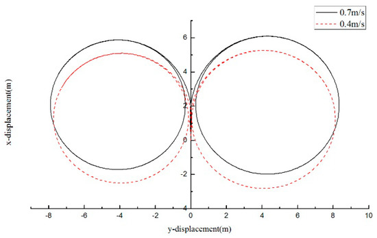At the beginning of the model test, the angle of the rudder was controlled at zero, the ship was maintained in a straight line, and a signal was sent to change the rudder angle. Next, the ship model started to enter rotational motion, and the position information was recorded by DGPS during the model test. When the ship entered a stable state of rotation, the diameter of rotation was recorded. The data of the turning test in the state of 35°, at speeds of 0.4 m/s and 0.7 m/s, is shown in Figure 8. The ship model enters the steady state for a moment, at which time the trajectories of the left and right are symmetrical. The difference from the different navigable speeds is apparent.