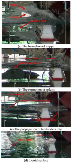 Figure 12 shows the sequence of images collected during the experiments. The No. 2 monitoring site is located on the landslide section, the No. 4 monitoring site is located on the area of the straight river, and the No. 6 monitoring site is located on the area of the river bend. Figure 12 illustrates that, after the landslide body enters the water, it interacts with the water body to generate a landslide-induced tsunami, and the waves scatter and propagate in all directions. The landslide-induced tsunami reaches the No. 2 monitoring point, and the No. 2 measuring point surge rapidly reaches its peak at t = 1.51 s. The first generated wave always has a first crest followed by a though. The main reason for this phenomenon is that the landslide body enters the water along the cross section of the river, rapidly moves the water body, and causes a change in the water level. Consequently, the landslide-induced tsunami travels at different speeds in different locations within the channel reservoir. The peak value of No. 2 monitoring point is greater than those of No. 4 and No. 6 monitoring points. The landslide-induced tsunami gradually attenuates in the propagation process, the peak value gradually decreases, and the impact on buildings in the channel reservoir gradually decreases.