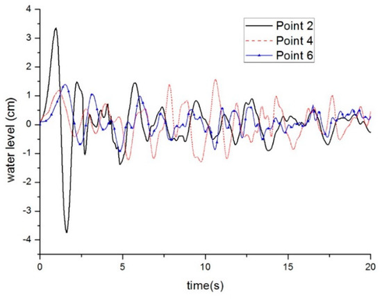 According to the layout of the measuring points during the test, the No. 2, No. 4, and No. 6 measuring points are 2.8 m away from the landslide point, and the propagation characteristics of the landslide-induced tsunami at the same distance and at different positions are studied.