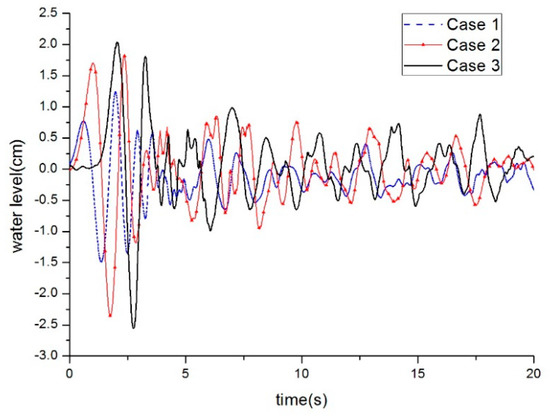 The landslide-induced tsunami characteristics generated by landslides with the same length and thickness but different widths are studied. The changes in the water level of the monitoring sites at rock masses with landslide widths of 0.5, 1, and 1.5 m are compared, as shown in Figure 14.
