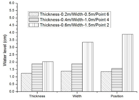 As shown in Figure 13, the wave heights generated by the landslides with different thickness values are different. The maximum water level and the minimum water level at each case are reported. The landslide-induced tsunami height increases as the thickness of the landslide body increases. Large thickness of the rock slope equates to large rock slope volume, high initial energy of the rock slope into water, high energy transferred to water during the exchange process, and highly intense movement of the water level. The landslide-induced tsunami generated by the landslide body entering water under any working condition also has a large initial wave height at t = 2.02 s. The energy during the propagation process decreases gradually and stabilizes in a stable state.