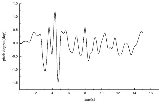 The response of the ship’s roll motion is similar to the pitch motion response. It is interesting to note that the pitch amplitude begins to decline when the incident wave period is further increased. The amplitude of ship motion changes 1 s after the landslide, and the time of the pitch motion response reaches the maximum at 4.5 s. The pitch amplitudes increased sharply when the incident wave period was close to the free decay pitch period of the ship. The maximum amplitude of the pitch response of the ship does not exceed 2°, which is within a safe and reasonable range, as shown in Figure 17.
