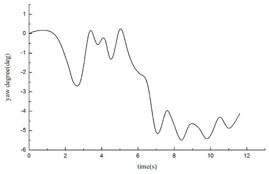 In order to provide a better understanding of the yaw response to the incident waves, it is desirable to plot the maximal yaw angle. As shown in Figure 18, after the ship model enters the test region of the landslide water, the ship model goes into a state of unmanned steering. The direction of the ship’s bow rapidly changes after encountering the effects of the landslide surge, and the direction of the ship’s navigation is changed. Figure 18 shows that the ship is in a landslide. Two seconds before the wave, the ship rotates clockwise. With the continuous action of the landslide surge, the reflected wave from the opposite side acts on the other side of the ship. The ship’s model is in a state of constant speed, and the port side of the ship is swelled. The stern begins to rotate counterclockwise as a result of the impact. The bowing angle continues to increase under the influence of the landslide and the inertia of the ship. In the testing of landslide-induced tsunami, the maximum angle of the sailing vessel is 5.5°, and the risk can be reasonably avoided by adjusting the rudder angle.