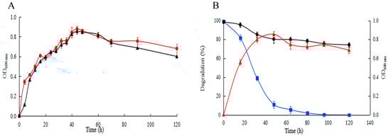 The growth of Bacillus cereus BCC01 and degradation of beta-cypermethrin. (A) The growth curves of strain BCC01. ●, LB media; ▲, with 100 mg/L Beta-cypermethrin in LB media. (B) Bacterial growth and related degradation of beta-cypermethrin. ●, beta-cypermethrin control without bacteria; ▲, growth in 100 mg/L beta-cypermethrin; and ■, degradation of beta-cypermethrin with Bacillus cereus BCC01.