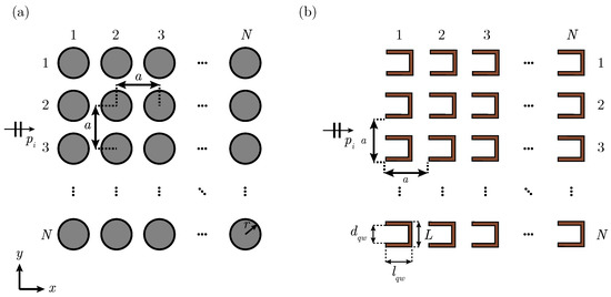 Two different 2D periodic structures of finite sizes are considered in this study, as shown in Figure 1. Both structures are composed of rigid scatterers arranged in a square lattice with a lattice constant m, embedded in air, where . The SC shown in Figure 1a consists of cylindrical rigid scatterers with radius m. The second periodic system is a metamaterial consisting of square scatterers with QWRs, as shown in Figure 1b. The geometric parameters of the resonator are its external side length, m, and internal dimensions, m and m. See Refs. [24,25] for specific details on the resonators. The host medium in both cases is air, with density and speed of sound kg/m3 and m/s, respectively.