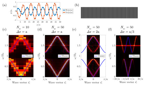 (a) Example of real and imaginary parts of the spatial pressure signal along the multilayer structure at the normalized frequency . (b) Periodic multilayer structure composed of periodic elements, combining two artificial materials with different acoustic properties. (c–f) Double FT of the pressure field and dispersion relation of the multilayer structure considering different number of periodic elements and different values of the spatial sampling .