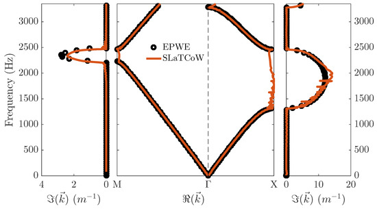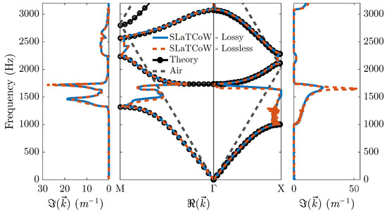 We then focus on the dispersion relation of the 2D acoustic metamaterial of finite size. Specifically, we consider the structure shown in Figure 1b, i.e., a periodic system composed of QWRs arranged in a square lattice embedded in air. Both lossless and lossy cases are considered with visco-thermal losses considered solely inside the QWR resonators [24,25]. Figure 4 shows the complex dispersion relation results of the 2D acoustic metamaterial. The real part of the wavenumber is shown in the central panel and results obtained using SLaTCoW are compared to those obtained solving an eigenvalue problem using the FEM over an infinite periodic structure with the same geometric and physical characteristics. Please note that the dispersion relation of the host medium alone, i.e., the air in this case, is also plotted in gray dashed lines.