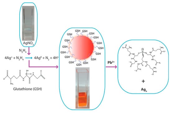 To synthesize these water-soluble silver NPs, Ag+ was reduced to Ag0 using the reducing agent of hydrazine as shown in Figure 2. The aqueous solution of GSH along with NaOH was mixed into AgNO3 solution, where NaOH was used to keep the solution pH neutral. Then, hydrazine was added as a reductant and the solution was incubated for 8 hours. Orange fluorescent GSH-coated AgNPs were obtained after being washed. In the presence of Pb2+, GSH would bind with Pb2+ to form a stable complex, leaving the AgNP surface. AgNPs would then dissolve as schematically shown in Figure 2. Here, the mechanism for complexation between Pb2+ and GSH was due to the cysteinyl S-donor atom in GSH. As shown in Figure 2, cysteine acts as a tridentate ligand for Pb2+.